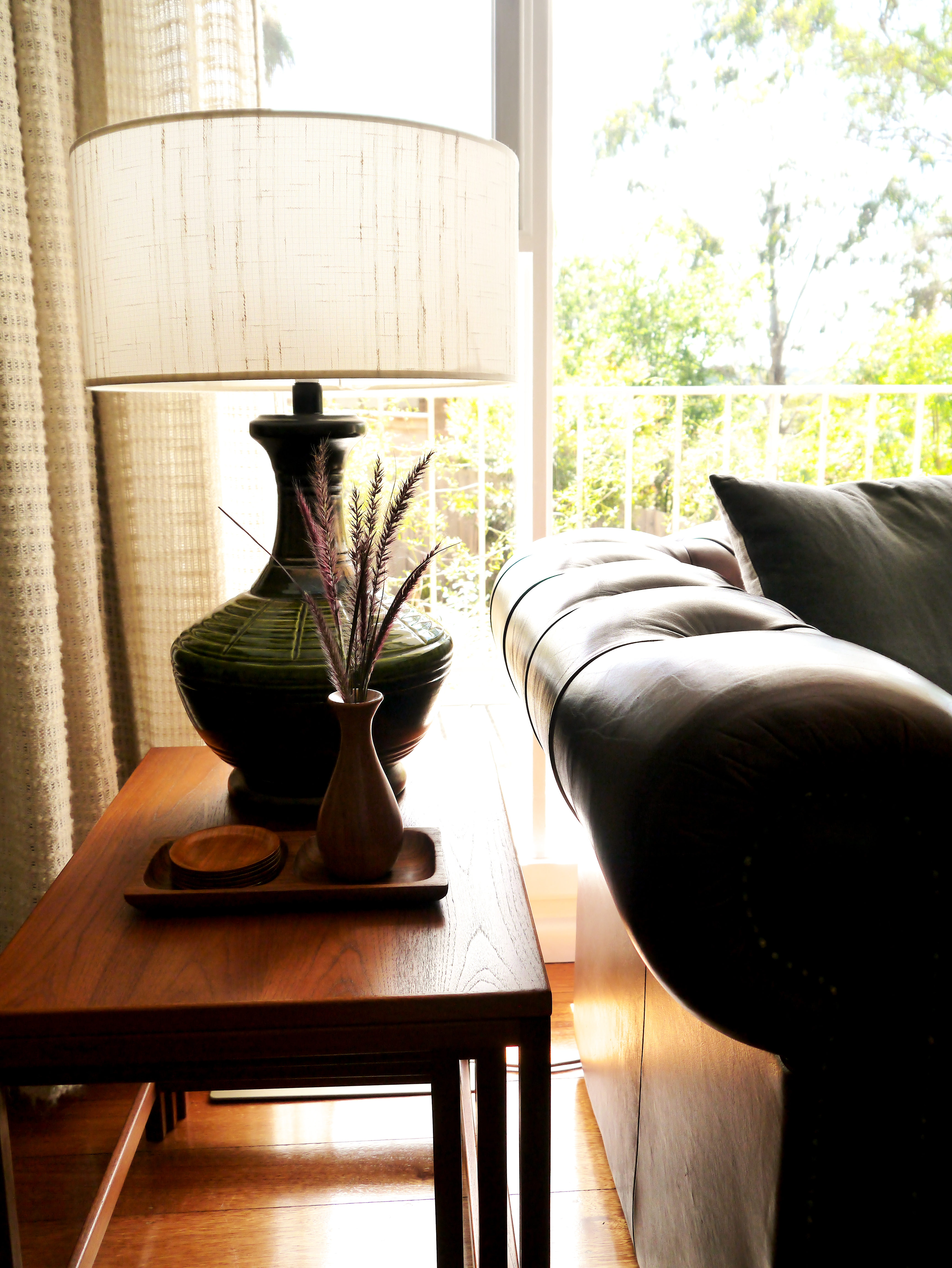 A glazed Danish table lamp sits next to the Chesterfield sofa