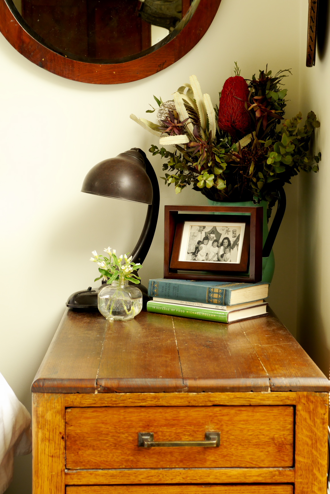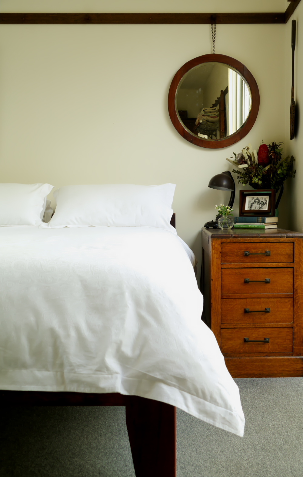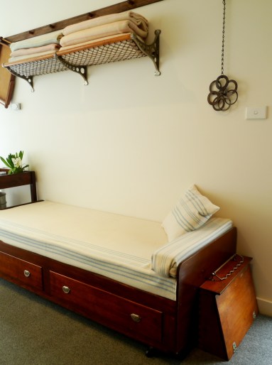 The day bed is Ramona’s favourite eBay purchase. On the shelf sit just a few of the 93 woollen blankets that she collects. The collection started with only Onkaparinga travel rugs and has evolved into old Australian woollen blankets.