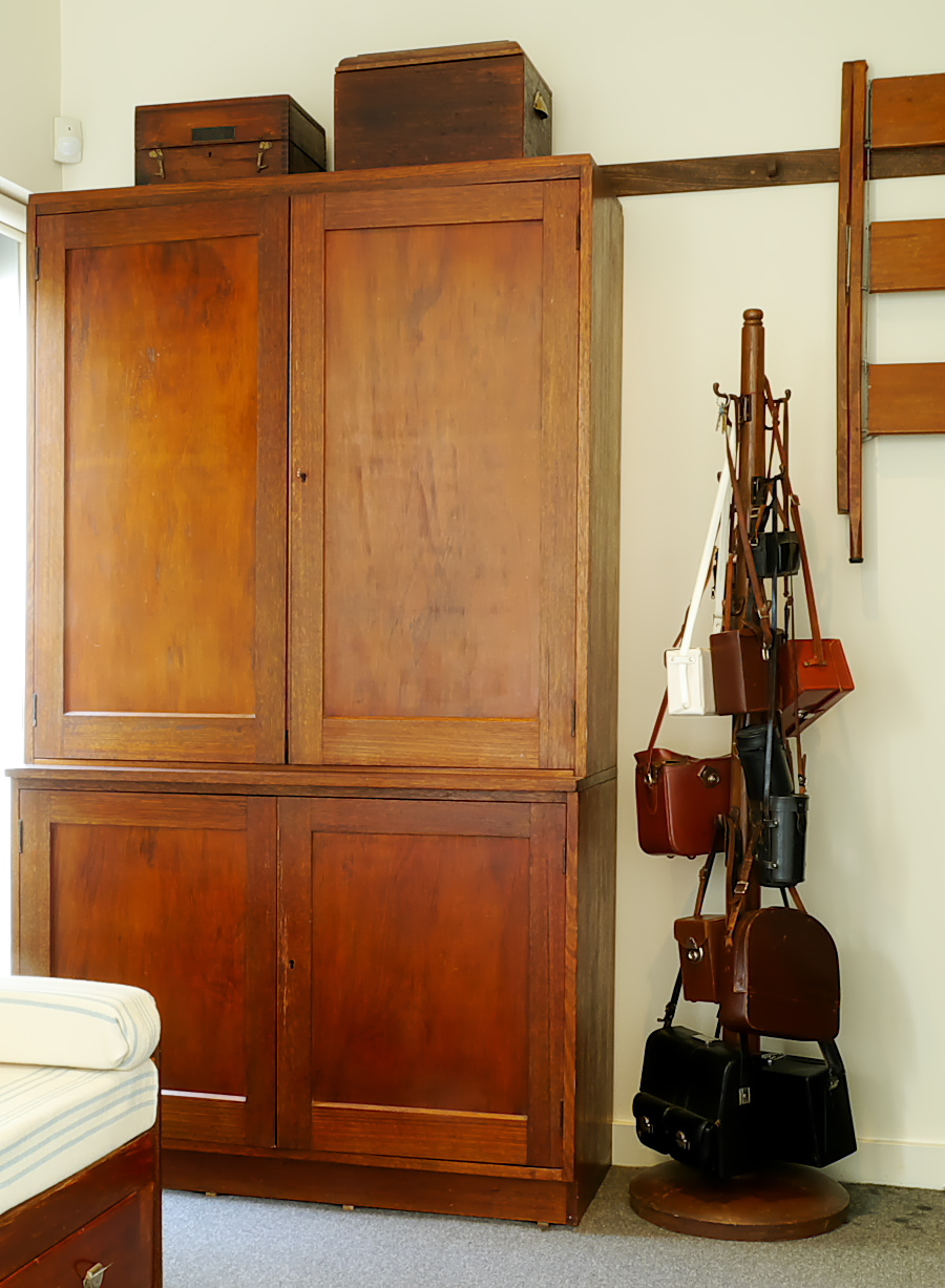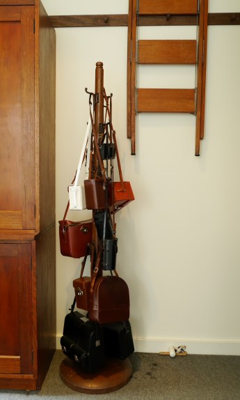 A collection of leather camera cases sit next to the timber ladder that hangs happily on the Shaker peg rail.