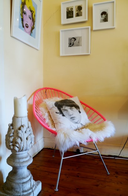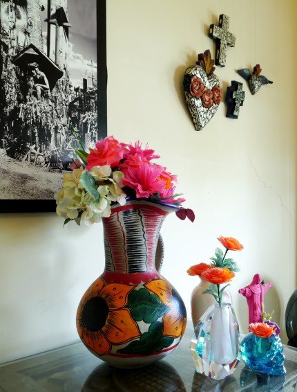 Lina has a love for Mexican antiques and home wares. The Mexican folk art vase sits happily underneath the he crucifix’s and love hearts (also Mexican) on the wall that are covered in silver milagros (prayer charms).