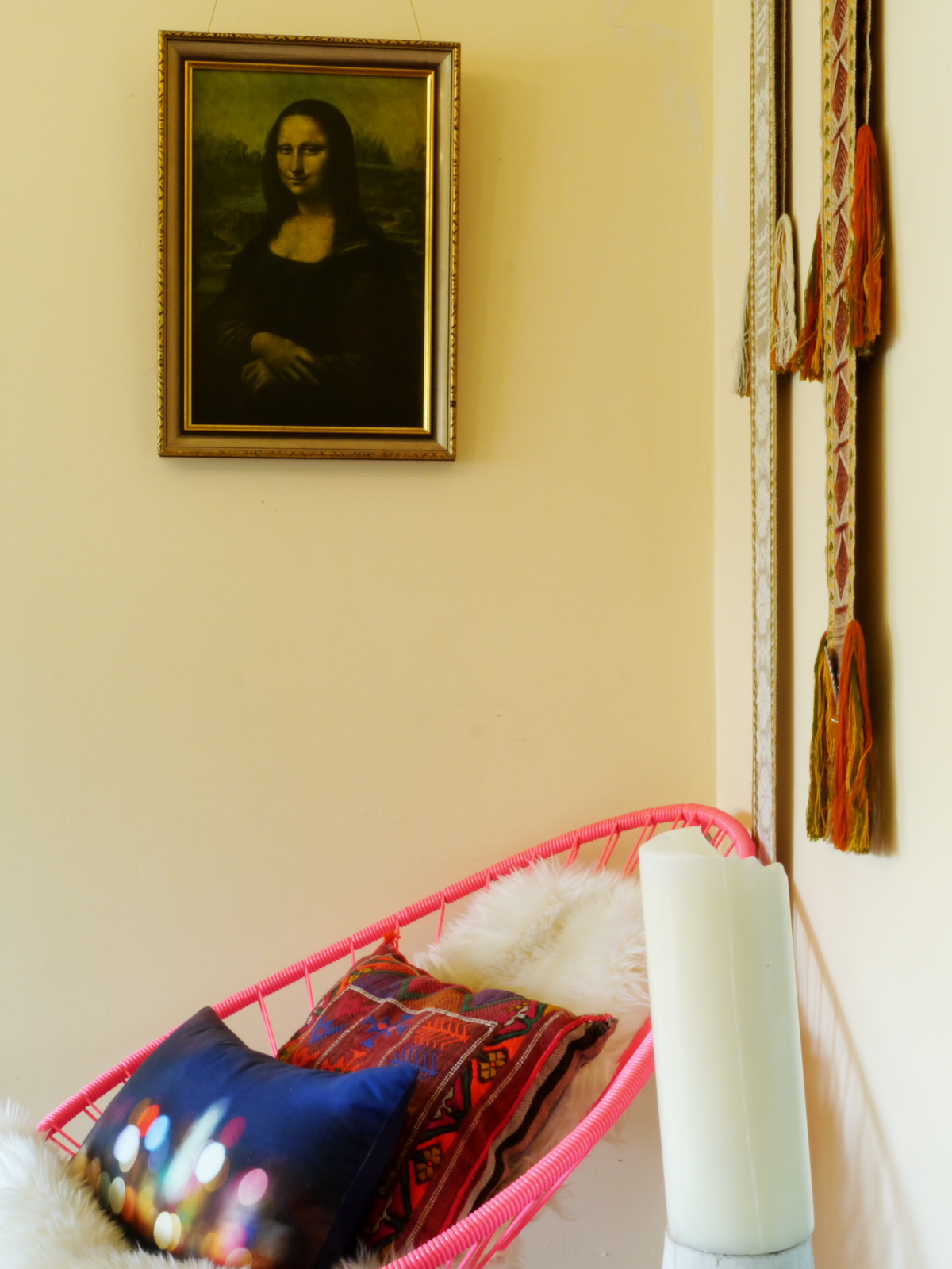 Lina has a love for Mexican antiques and home wares. The Mexican folk art vase sits happily underneath the he crucifix’s and love hearts (also Mexican) on the wall that are covered in silver milagros (prayer charms).
