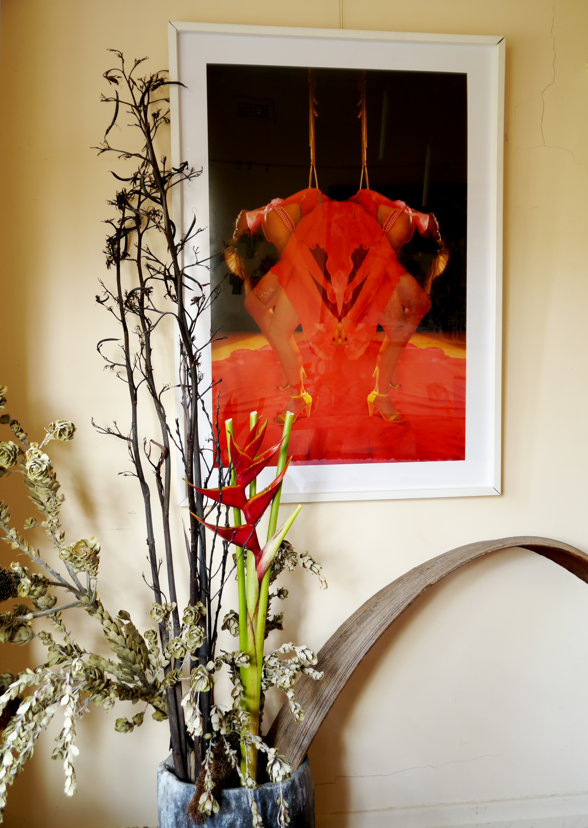 The print of the woman in the red dress was taken during Lina’s time working as part of a fashion label known as – ‘a name is a label’. It was a publicity shot, using one of their dresses and a necklace they had made. The model was tied up in rope and hung from the ceiling. Lina’s friend still runs the label and “makes amazing clothes”.