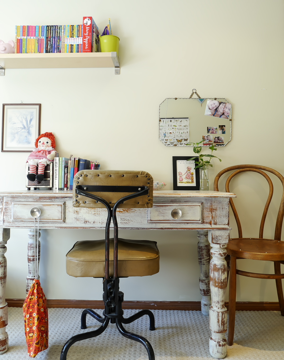 The vintage tin, bought in Bendigo, works as the perfect storage for all of Emilia’s pencils, writing pads, erasers….