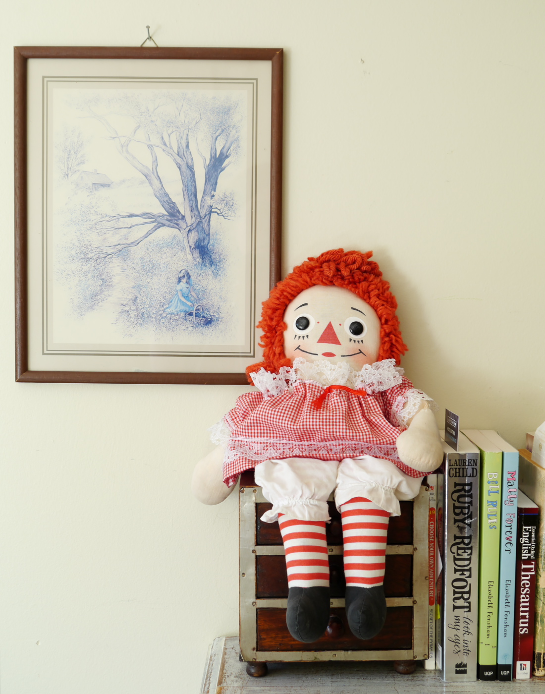 Emilia’s mum Kellie had a Raggedy Ann doll when she was a child. “She lost all her woollen hair and got chewing gum stuck to her face. When I saw this Raggedy Ann doll in a second-hand shop, it was like seeing her again!”
