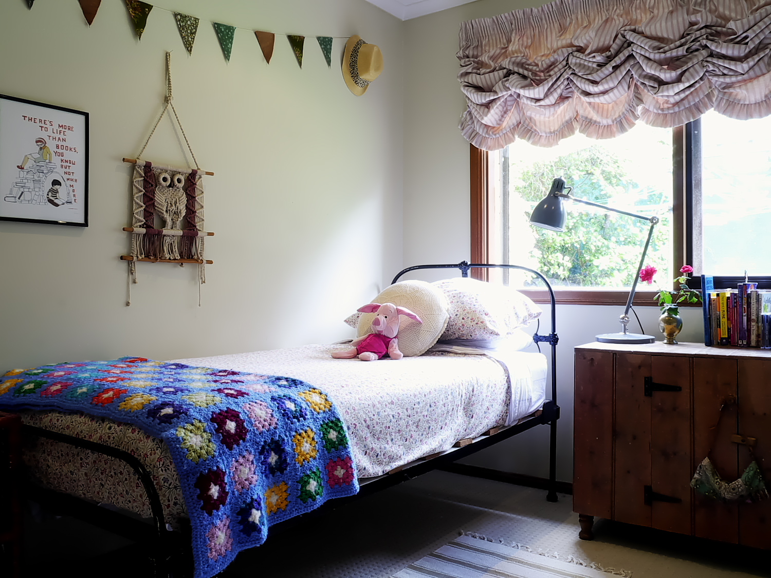 The woollen owl hanging on the wall was purchased from a warehouse in Fairfield, with a massive selection of retro clothing and home wares. The owner boasted that the furniture and clothing he sold had been used on popular Australian television series which were set in the 50s, 60s and 70s.