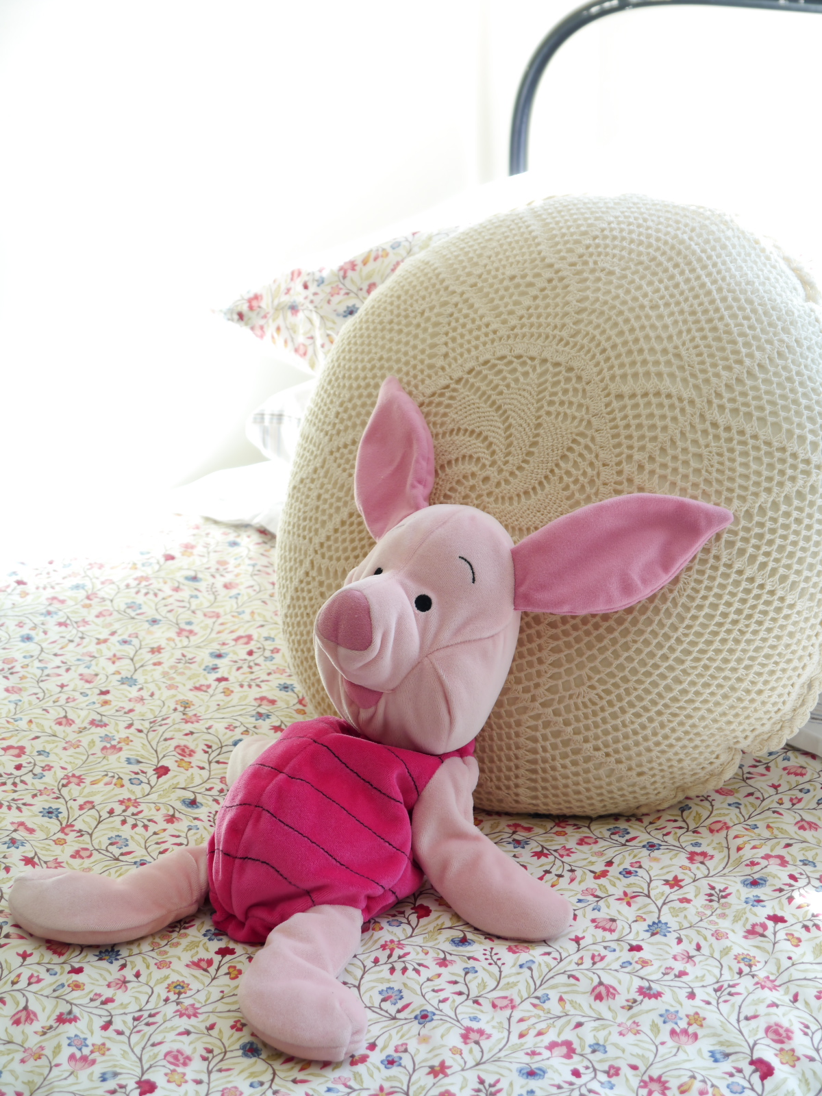 Piglet was a gift from Emilia’s aunt when she was born. The arms and legs dangle from the body like cooked spaghetti, thanks to all the years of loving…