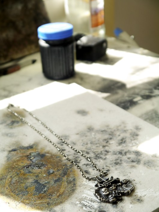 Megan’s treasure chest, full of little mementos that have played a part as inspiration for her work. “I have a lot of seahorses around my studio (all having departed this world of natural causes). They are such whimsical creatures. I had a mold made of the largest seahorse in my collection. He is so perfect, I’ve used his tails on one of my large neck-pieces and have quite a few more designs with him in them that I’m hoping to finish soon.”