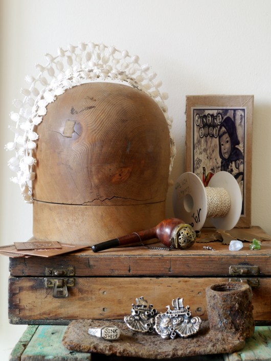 The vintage hat block is wearing one of Megan’s favourite headpieces. “I was told it would have been worn as a wedding headdress in the 1960’s or 70’s.”