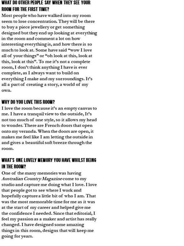 “This is Miss Betty. I always loved these vintage mannequins growing up. She’s a size twelve with great curves and funny shaped breasts. She’s a little grubby but that’s her history! I move her around the house, dressing her in different things depending on how I feel, but for the next couple of months she is staying in my studio so I can use her to see how my new deigns are going to sit on the body. I have a runway show for RAW Melbourne in July ‘Into the forest and down to the sea”, and there will be a sailor, a siren and three birds. I’ve been pinning ideas/objects onto her and seeing how some of the costumes look before they get tailored to fit the models.”
