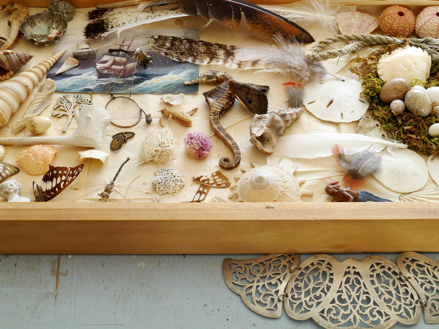 Megan’s treasure chest, full of little mementos that have played a part as inspiration for her work. “I have a lot of seahorses around my studio (all having departed this world of natural causes). They are such whimsical creatures. I had a mold made of the largest seahorse in my collection. He is so perfect, I’ve used his tails on one of my large neck-pieces and have quite a few more designs with him in them that I’m hoping to finish soon.”