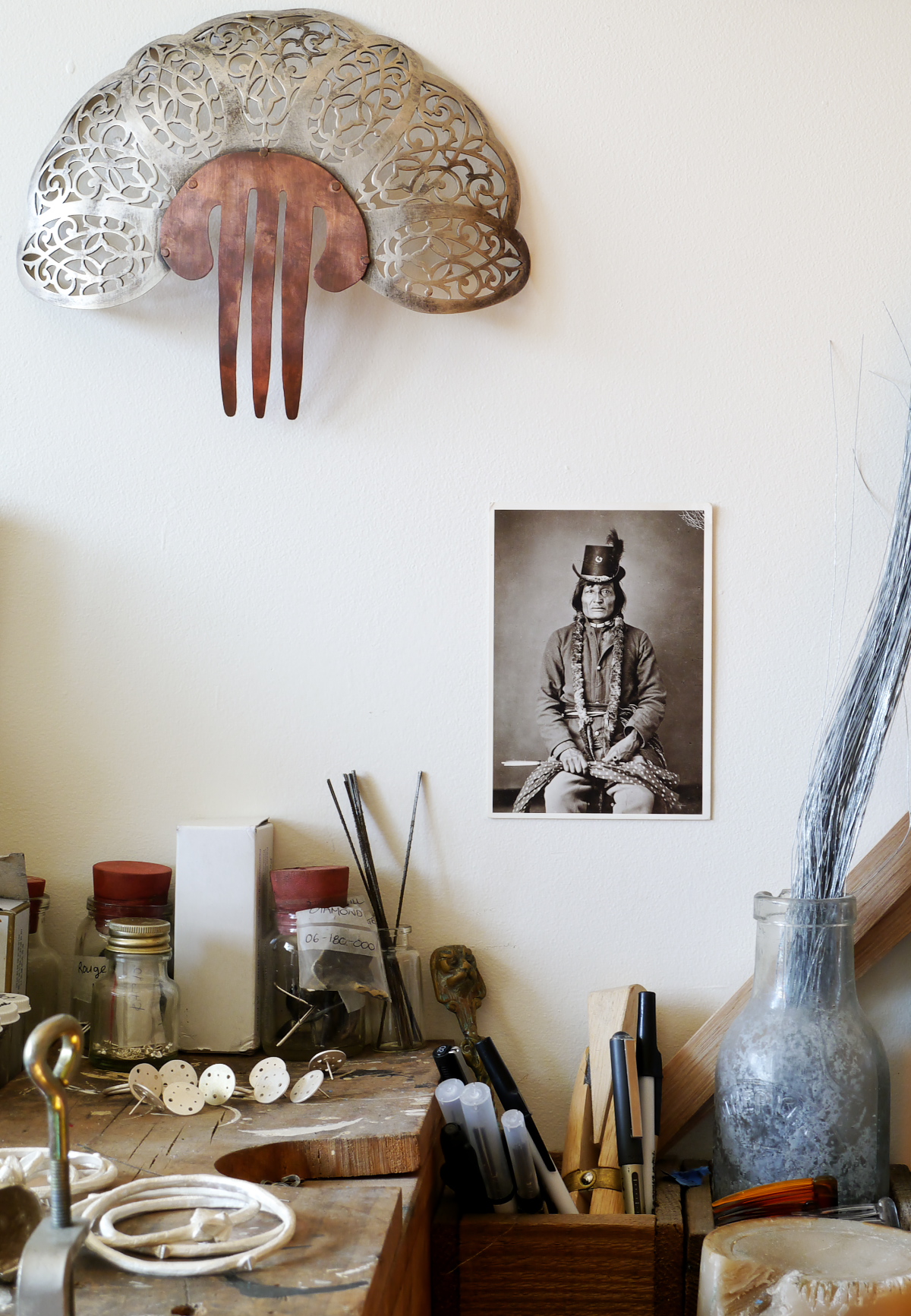 The cutlery piece sitting in the glass bottle was bought from an antique shop. “It reminded me of King Triton’s trident and I loved its shape. It also reminded me of the poles on a vintage carousel… this piece has inspired a lot of ideas.”