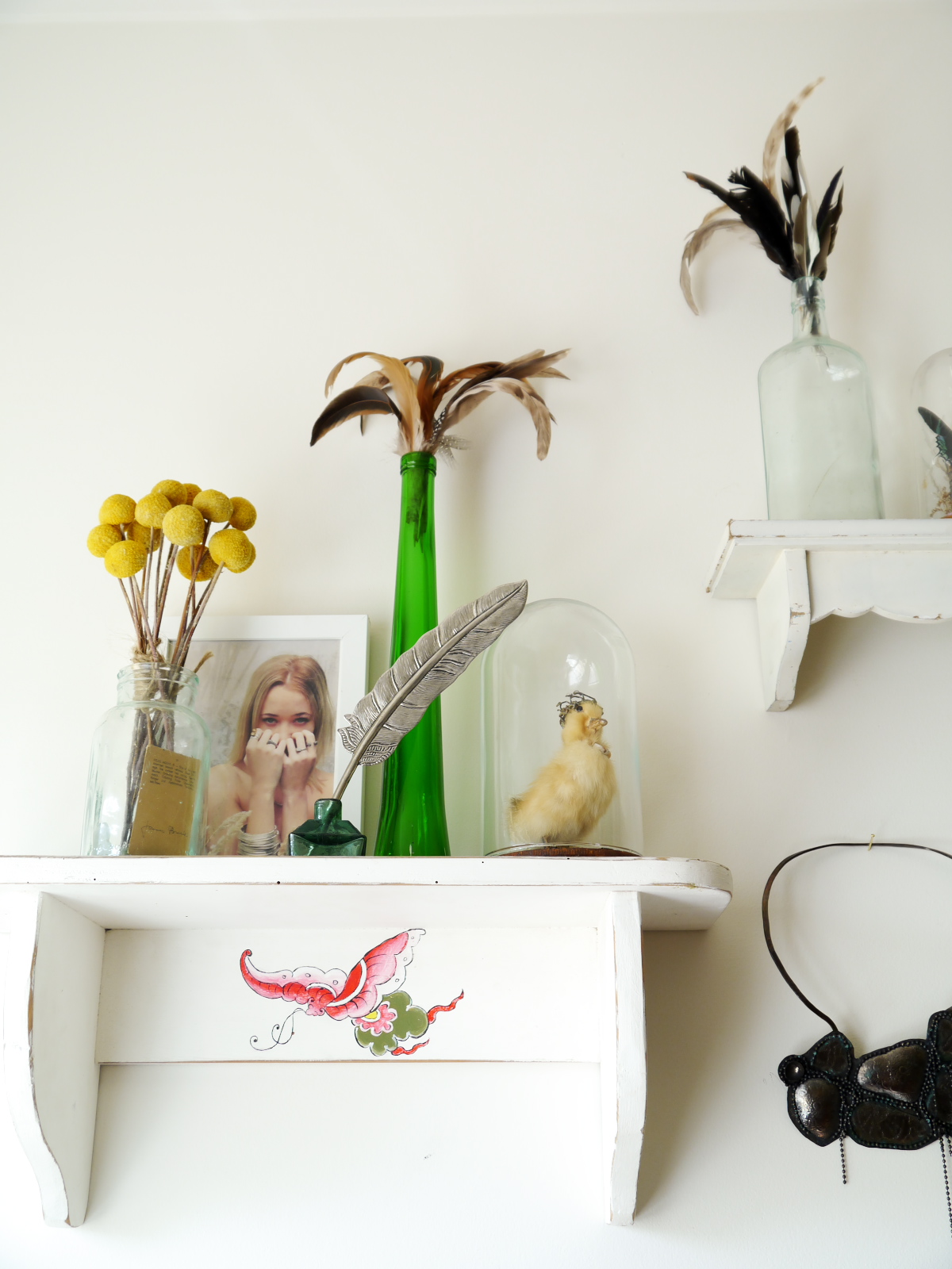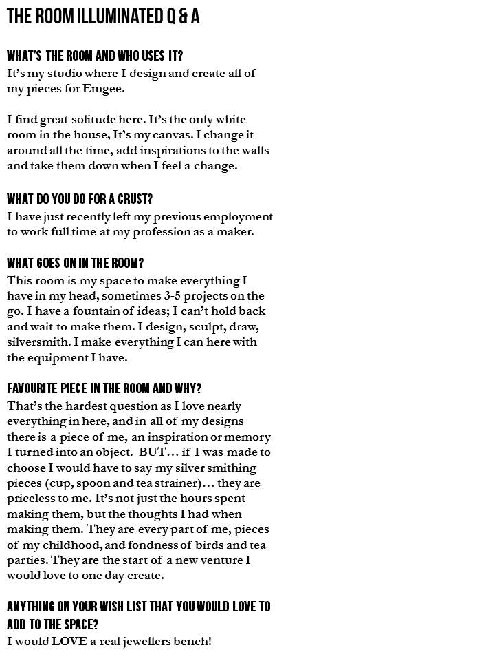 Megan has a large collection of feathers. so when she made the decision to take a little break from my silversmithing, she made herself a feather garland -“All while I was watching and singing along to ‘The Sound of Music’. The large piece of drift wood Braden and I found on our last summer holiday to one of our favourite beaches. We collected some beautiful little treasures from there that will also be made into pieces of art soon.”