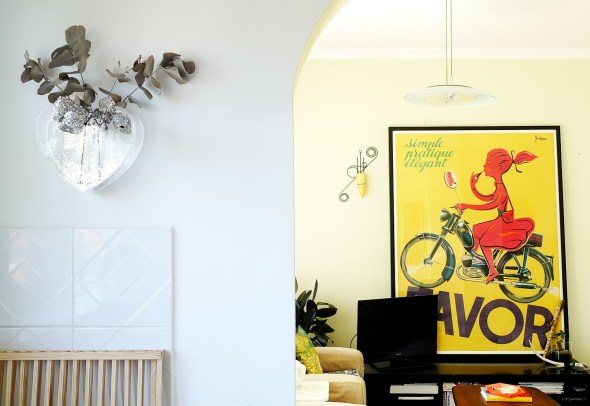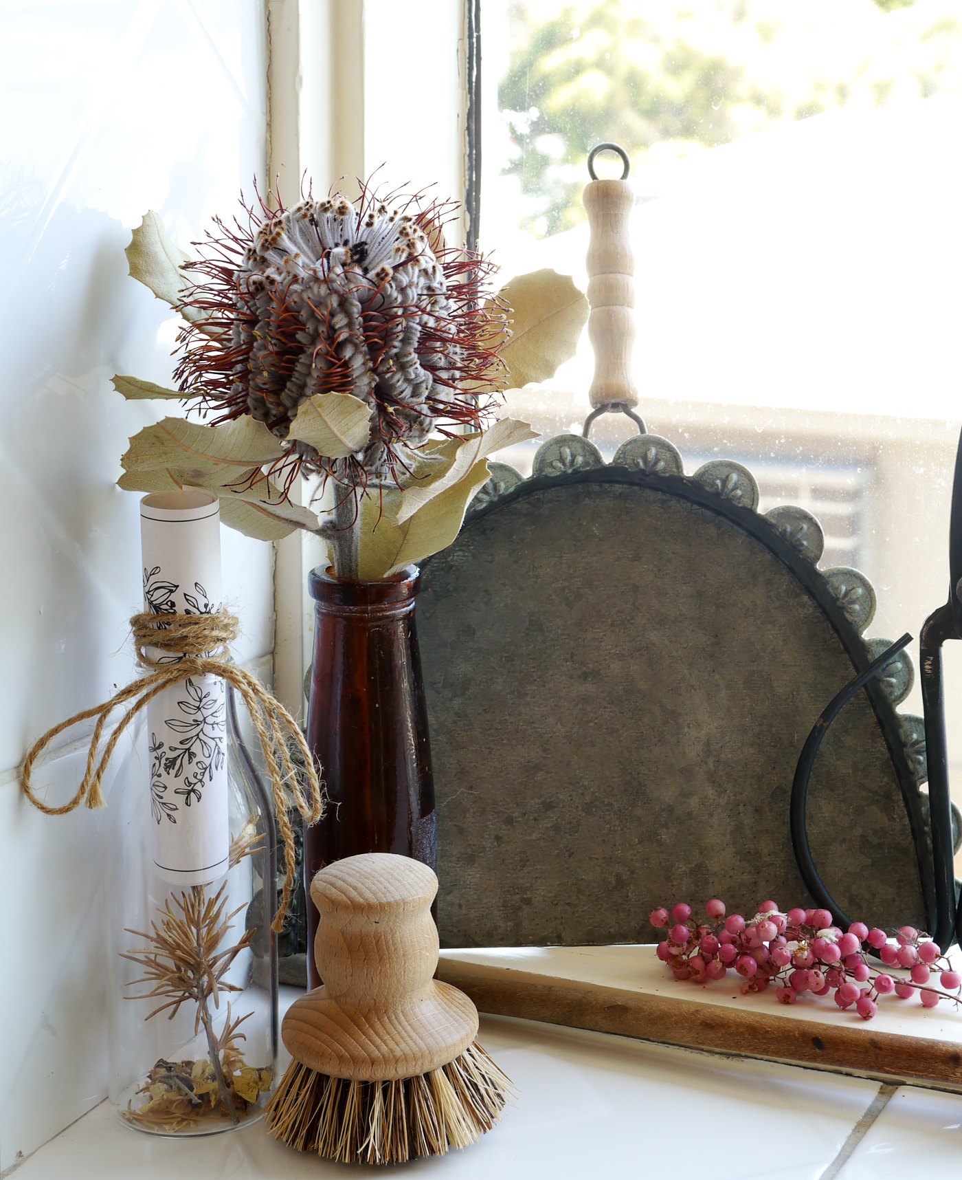 A lovely little collection of treasures sit on on the window sill. “I love my little window collection… the brush and metal pan are from my favourite shop, Scout House in St Kilda. The little bunch of pink peppercorns I foraged on a road trip through outback NSW last Christmas.”
