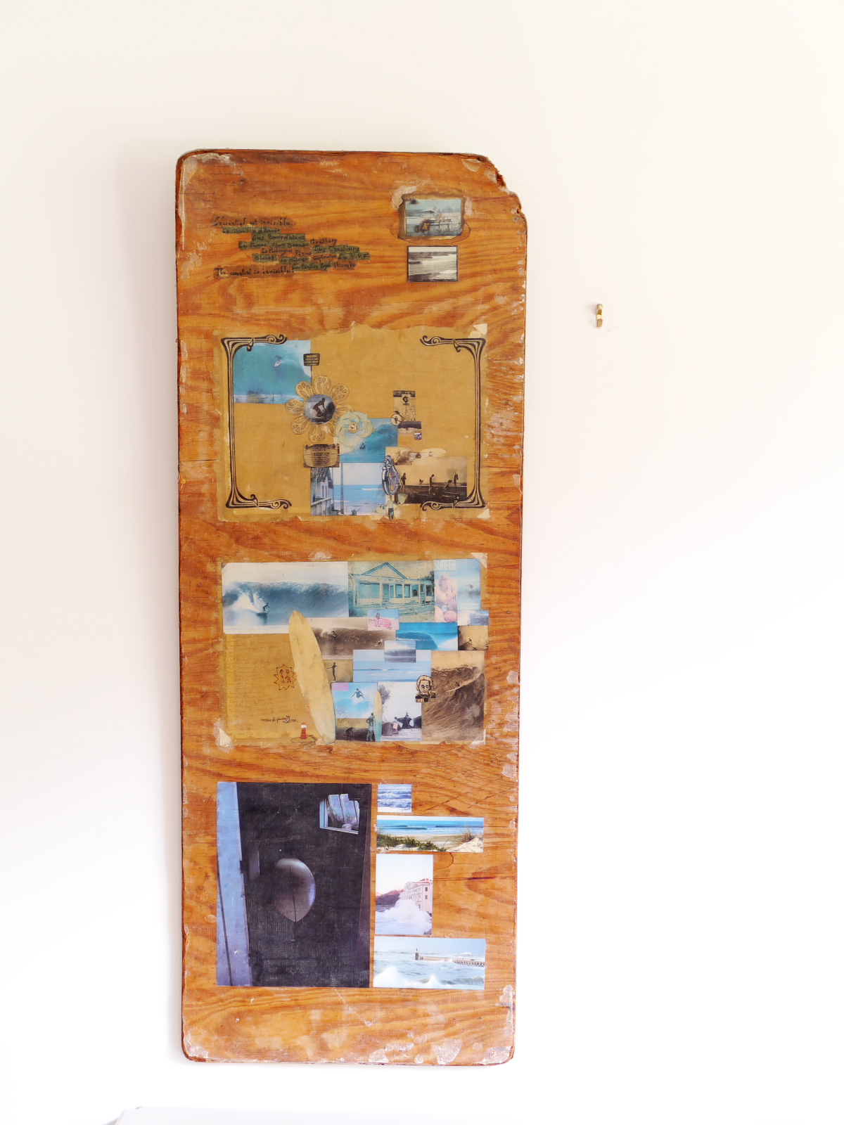 Nahmi’s favourite piece – recycled , weathered plywood that was found on the beach by her husband, then collaged and coated in resin. “I love that he can find objects and turn them into art.”