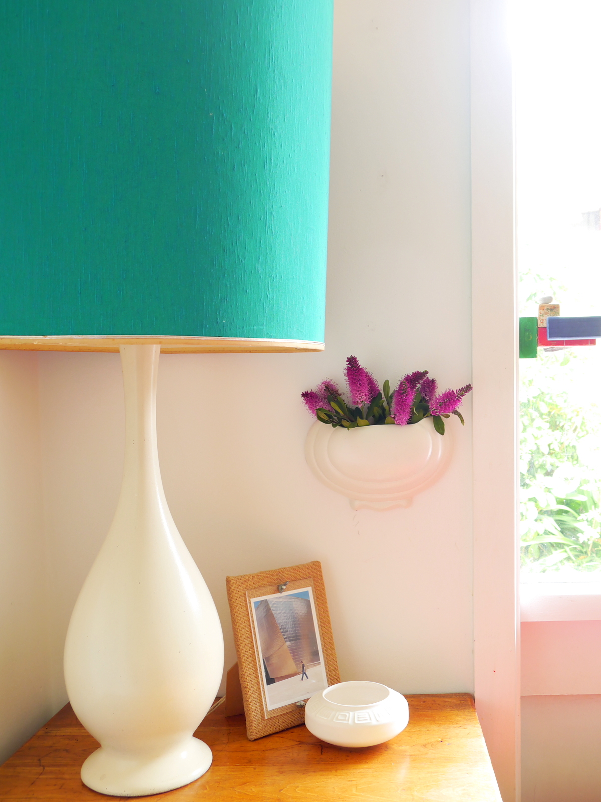 “The cream ceramic vase base was found on it’s own in an op-shop and I waited years for the right lampshade to turn up. Finally it did in brilliant turquoise!”