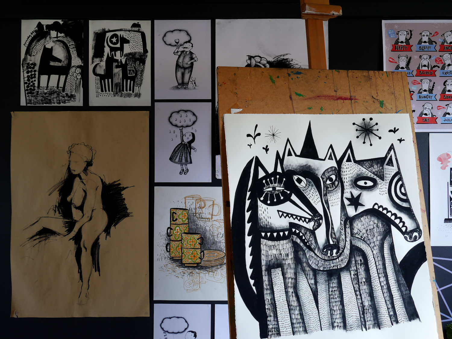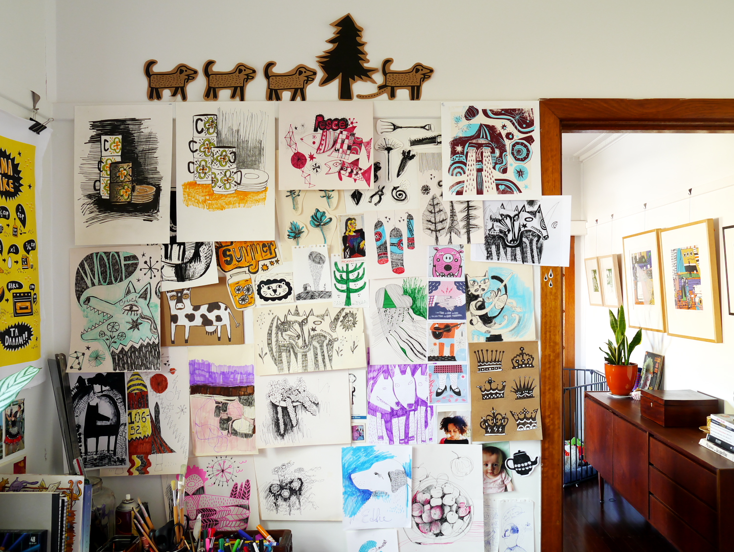Tonia’s concept wall – jammed packed with past, present and future works – is her favourite thing about the space.