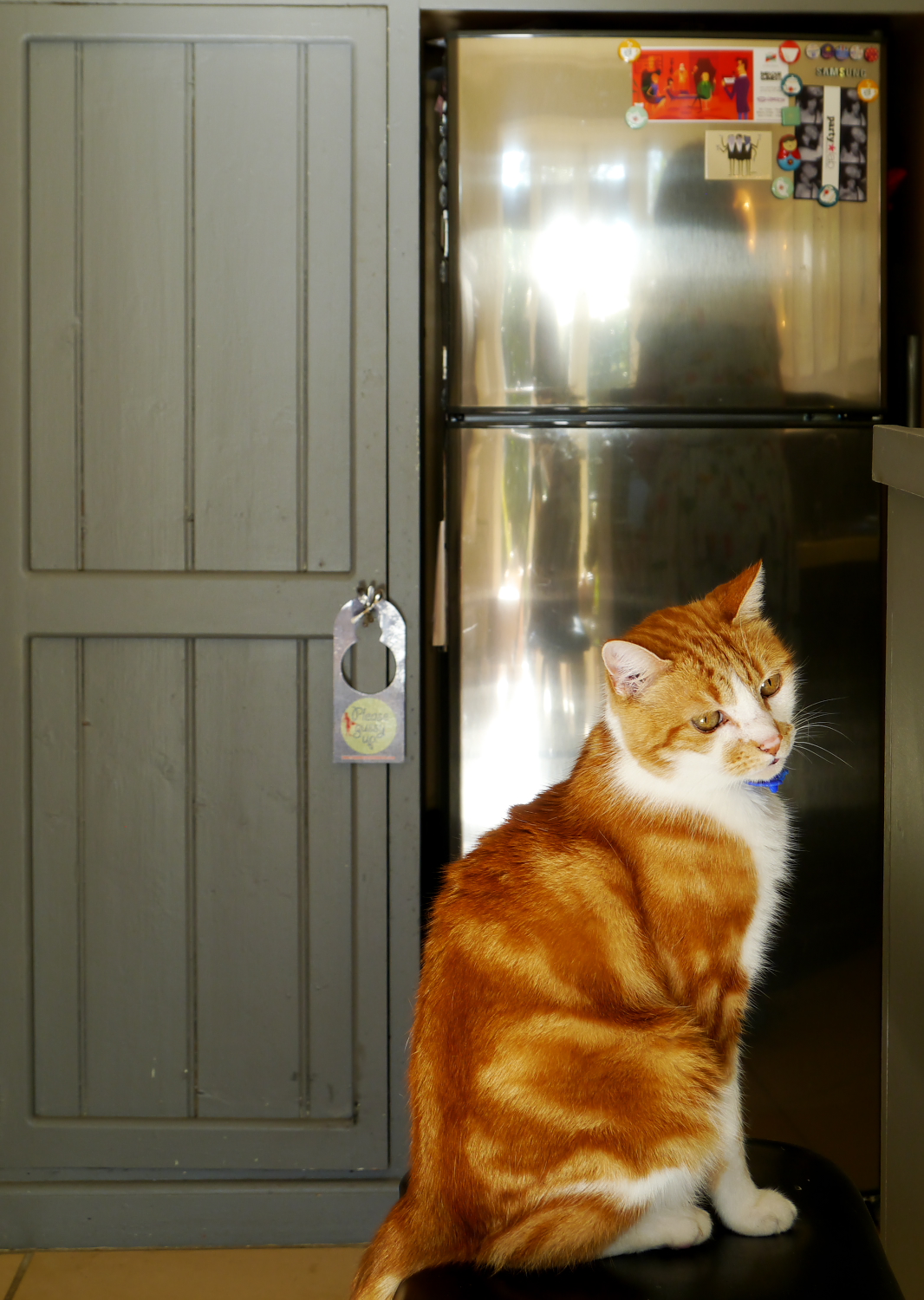 “Frenchie was a farm cat, and we have had him since he was a kitten. He was in a tragic combine harvester accident at a very early age which is why he only has half a tail, and why we chose him from the million cats the farm lady had running in and out of her caravan, or resting in assorted shoe boxes around her yard (I’m not even kidding!). He is the perfect combination of adorable and lazy which suits us very well.”