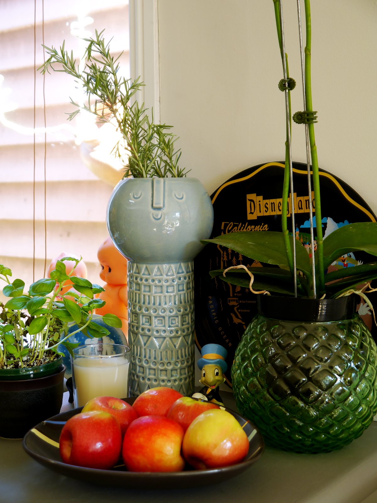 “The dolls in red outfits are American Campbell’s Soup dolls from the 40’s and 50’s. We bought them all beat up and filthy at a flea market in Brooklyn for about ten bucks. I cleaned them up and left them to soak in our hotel bath tub for the day. When we got back to our room, they were fully dressed and sitting up on the bed. They have been known as the ‘creepy dolls’ and been a little bit intimidating ever since.”