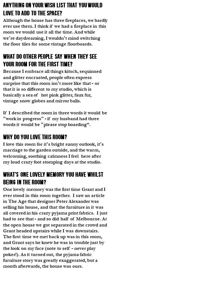 “I love this room for it’s bright sunny outlook, it’s marriage to the garden outside, and the warm, welcoming, soothing calmness I feel here after my loud, crazy foot stomping days at the studio.”