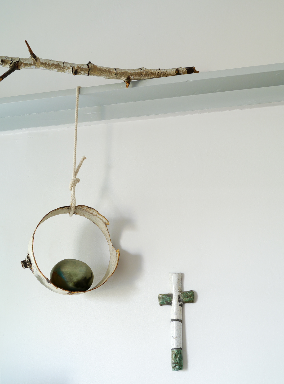 So hard to choose! Perhaps my ceramic ‘Floating Stone’ by Scottish artist Lotte Globb. As I just love her approach to art, we visited her studio on the top tip of Scotland, overlooking the ocean, when we were living there over six years ago. She creates these ‘floating stones’ – each one unique, and goes on several-day-long solo hikes around the highlands, documenting her journey and eating a simply divine diet of cheese, oatcakes, whisky and water! She then leaves her floating stones on a loch and photographs them, leaving them to be at one with nature and perhaps be discovered by a passer by one day. The floating stone is hanging perched upon my ‘sea crown’ that I collected on a Scottish beach. The two seem to go so well together, and remind me of the rugged, dramatic landscape that makes everyone want to drink whisky to keep warm!