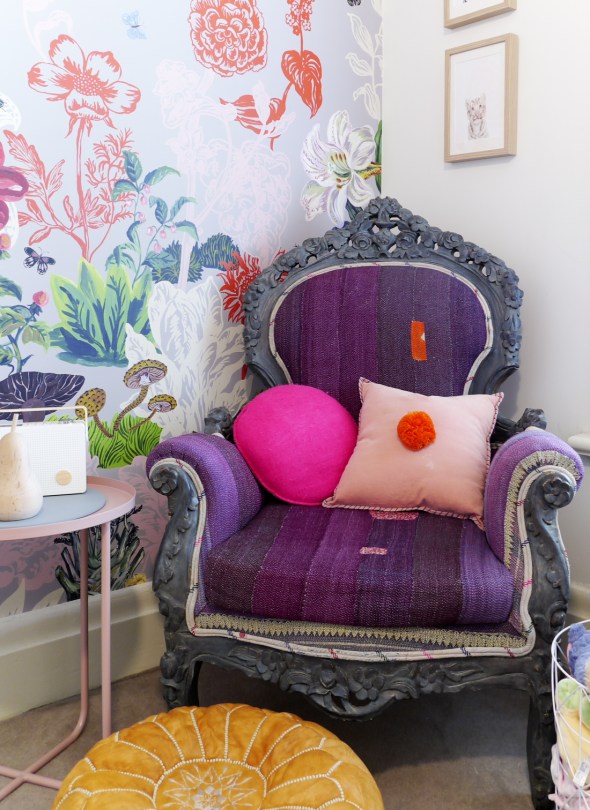 The wall paper was designed by French Illustrator, Nathalie Lete. ” It was a definite extravagance but well worth it! It is like a secret garden.”