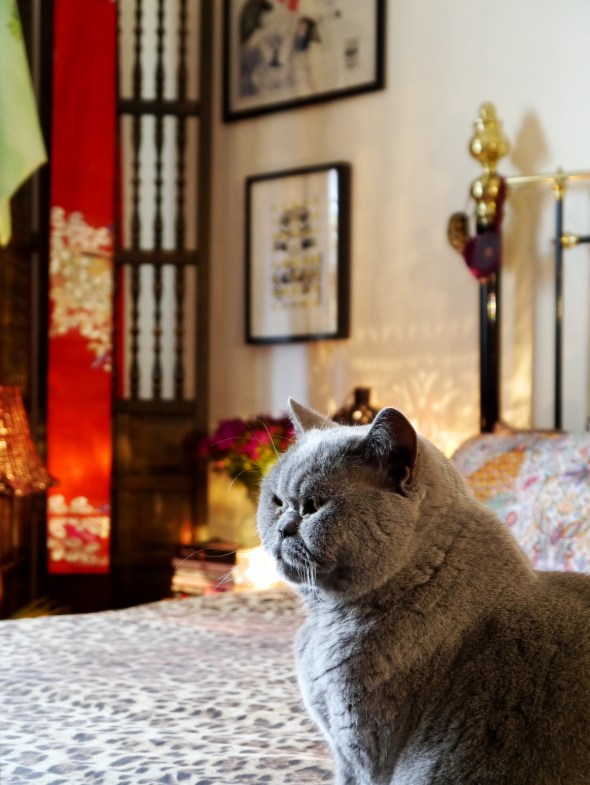 The room is my boudoir/sleeping quarters/dressing room/pleasure dome, primarily used by me, and my alter ego Ruby Slippers. Also my housemate’s cats like to take turns sleeping on my bed.