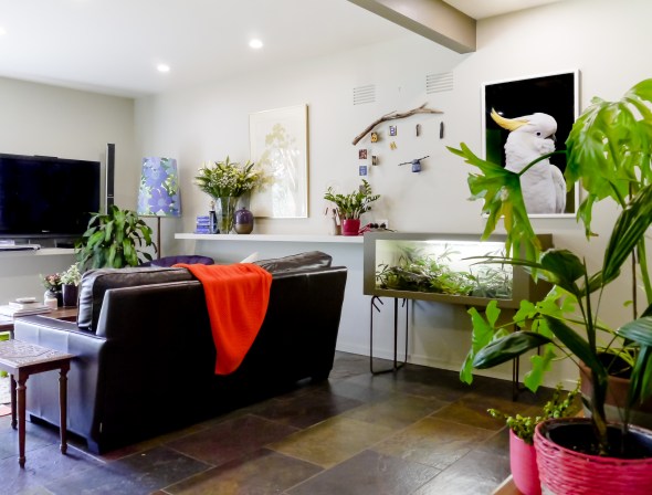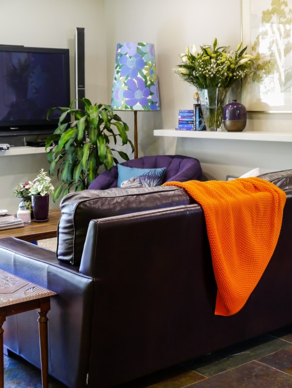 I love this room as it is the first room in my home that I have totally designed and decorated from scratch. My husband Andrew is a builder and so he has done all the hard work, such as replacing a mismatched window, re-plastering, laying the slate floor tiles, painting and making the built in storage cupboard that stretches along the entirety of the back wall. A recent addition was the coffee table which he made from an old ironbark crossbar and plumbing fittings as legs.