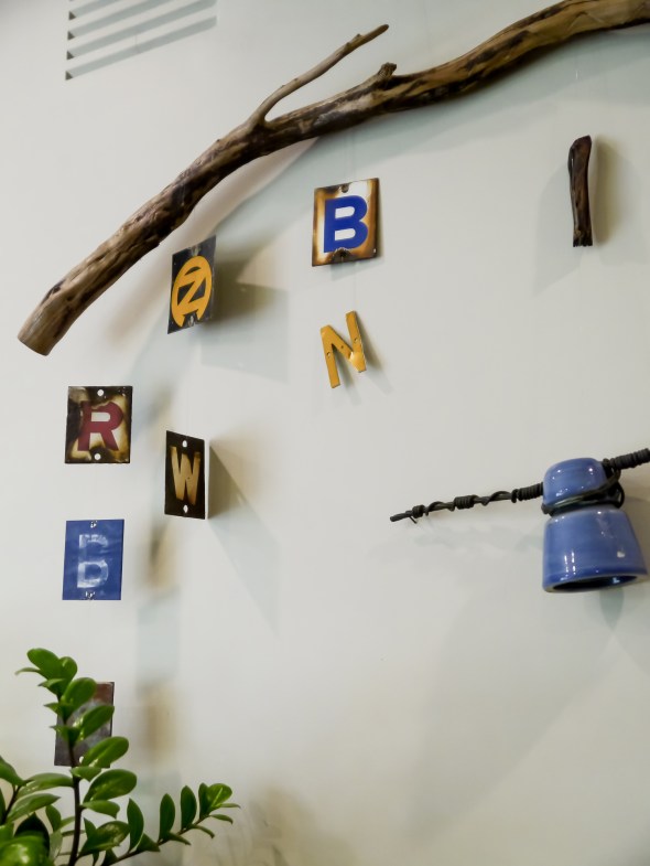 This fun family project hangs on the wall . “The piece of drift wood was picked up from a beach family holiday we went on a couple of years ago. The iron numbers & porcelain conductor came off the ironbark crossbars from old power lines and pieces of petrified wood were a memento from a recent holiday to Penola S.A. So we combined all these pieces into a sculptural wall hanging!”