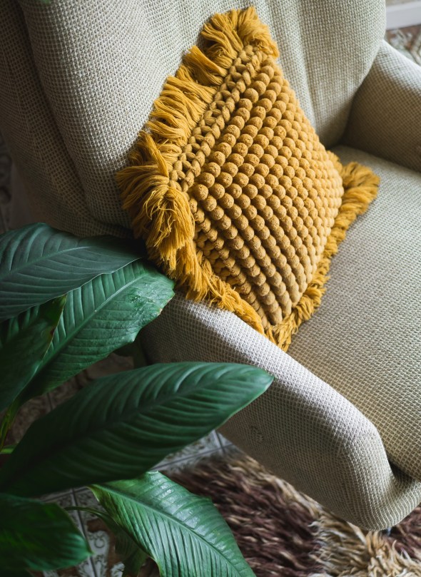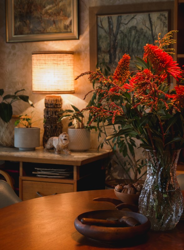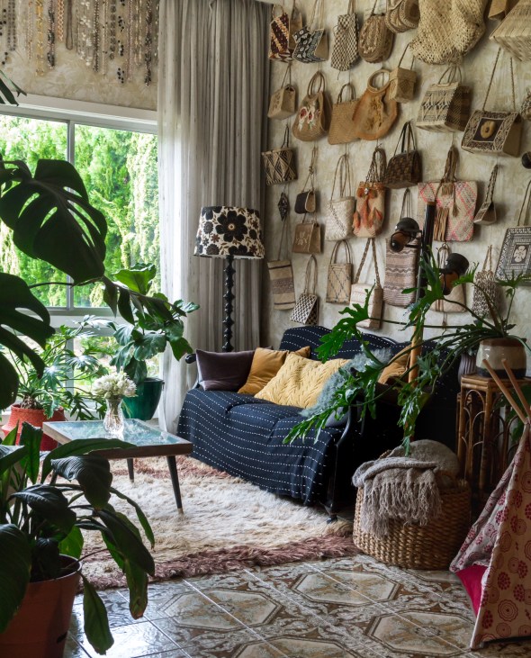 It’s the shell necklace collection. I started collecting them when I was 20 in New Zealand. They come from op shops and friends. There are over 350 and I love them all. And yes, there are occasions I pop one or two on. I have even made friends via my shell necklaces! It is a pleasure to collect them and make a new hook to hang them on each time. I have certainly found the perfect house to display them in. I have not made one myself, though I have made many of the woven baskets in this room. They compete with my favourite pieces actually.