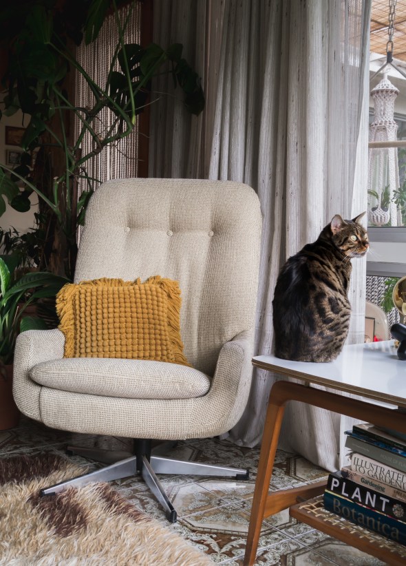 Victoria shares the sunroom with Daphne, her Bengal cat.