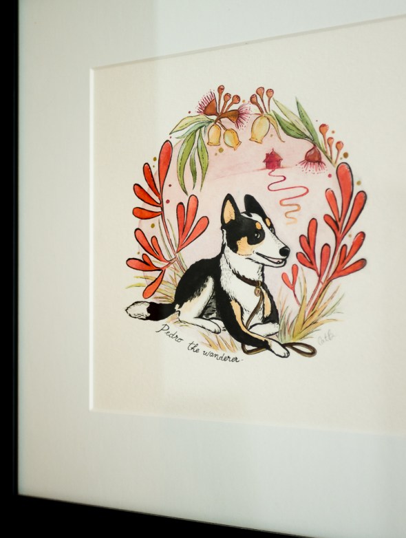 The portrait of our dearly departed dog – Pedro, was painted by our talented friend and illustrator, Catherine Berruer , for my (Kate’s) 40th. It moved us both to tears to see his smiling likeness perfectly captured.