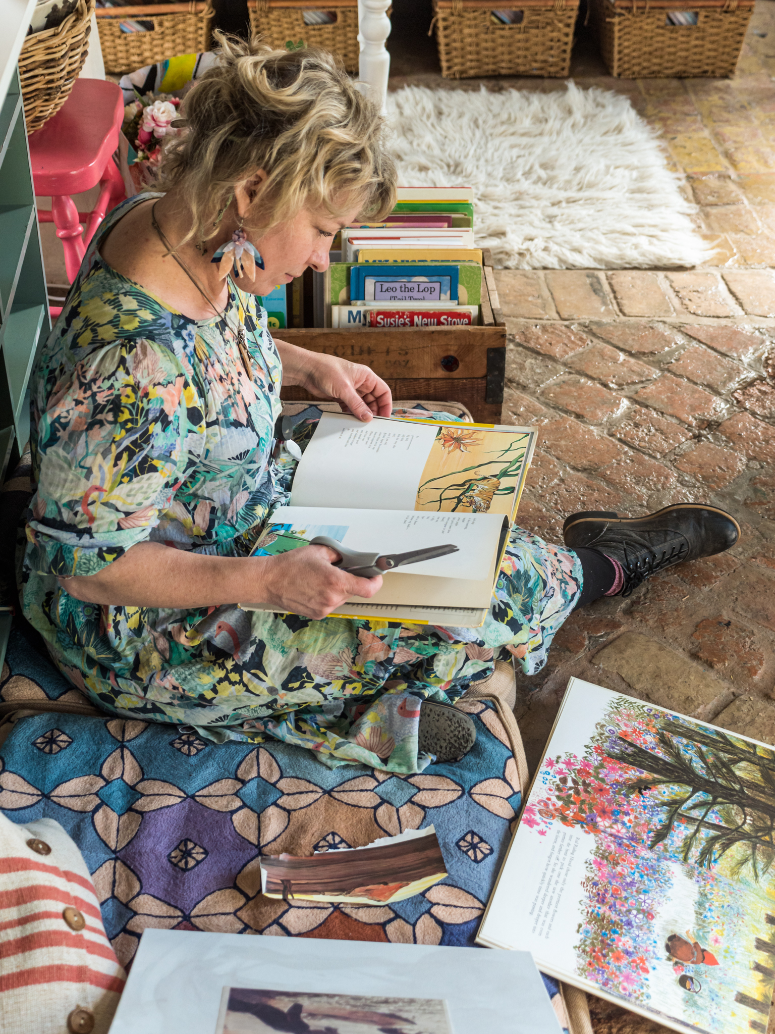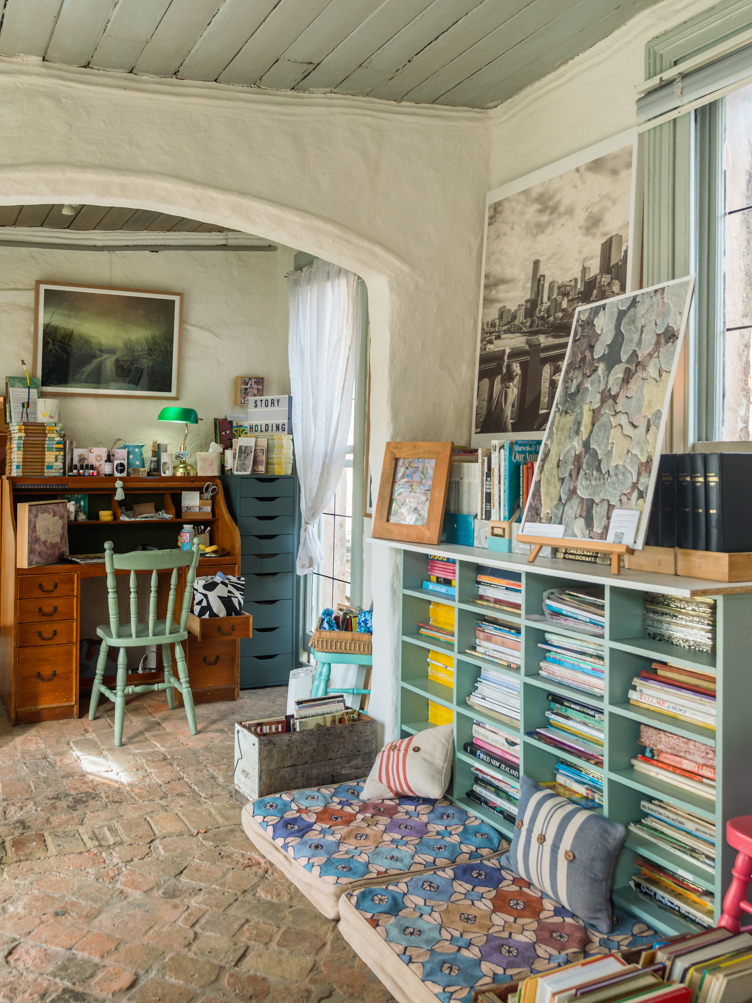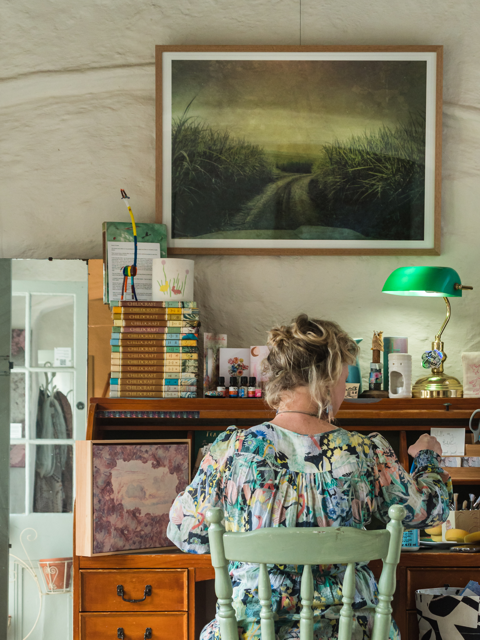 I’m BIG on ritual and mood. So, first, NOTHING can happen here WITHOUT some sort of flame lit – be it one of my candles, or room diffuser, which is ALWAYS burning some sort of certified organic aromatherapy oil(s) grown, distilled and packaged on our family farm in the heart of Zululand, South Africa. Then, the kettle is boiled. A FULL one, in case someone wants to pop over for some collab or chat or just to be. Like I’ve said, this space is like medicine for the soul. Then, SOUND. What is life without music (unless nature or real-life chats provide enough) or some sort of fascinating podcast where I can just learn more and more about intriguing stuff. So, once I have fire, sound & boiling water in my thermos, I get down to business… or play! But all play is business for me, because every bit that happens in that room, contributes to stories. I’d either cut up vintage children’s books, encyclopaedias, children’s Bibles, National Geographics, old greeting cards and magazines to form a story around one of my fine art photographs. I feel a bit like a Sangoma (Traditional African Healer) sourcing all the images and throwing them out in front of me as I move into flow-state, arranging them all onto a canvas so that slowly, the textured layers begin to make sense of all the gazillion movies looping in my psyche. When I’ve done a photoshoot, this is also where I’d edit my photos, most of them which have been shot in this very room, or on the historic Montsalvat grounds surrounding me. When I’m not deconstructing and reconstructing old things into new things or shooting or editing anything, I either write, have other artists or visitors over for coffee or a chat, or dream on my daybed.