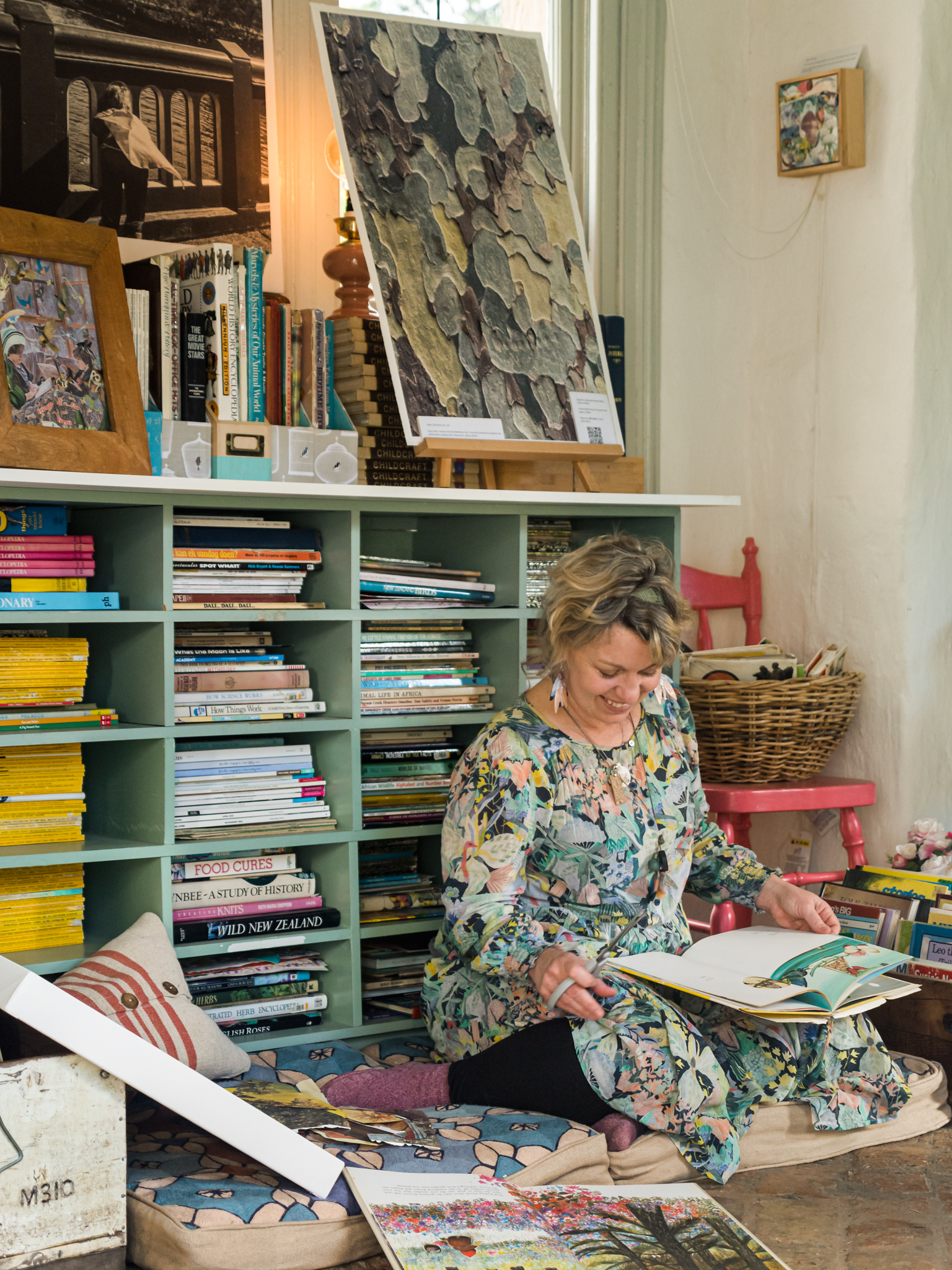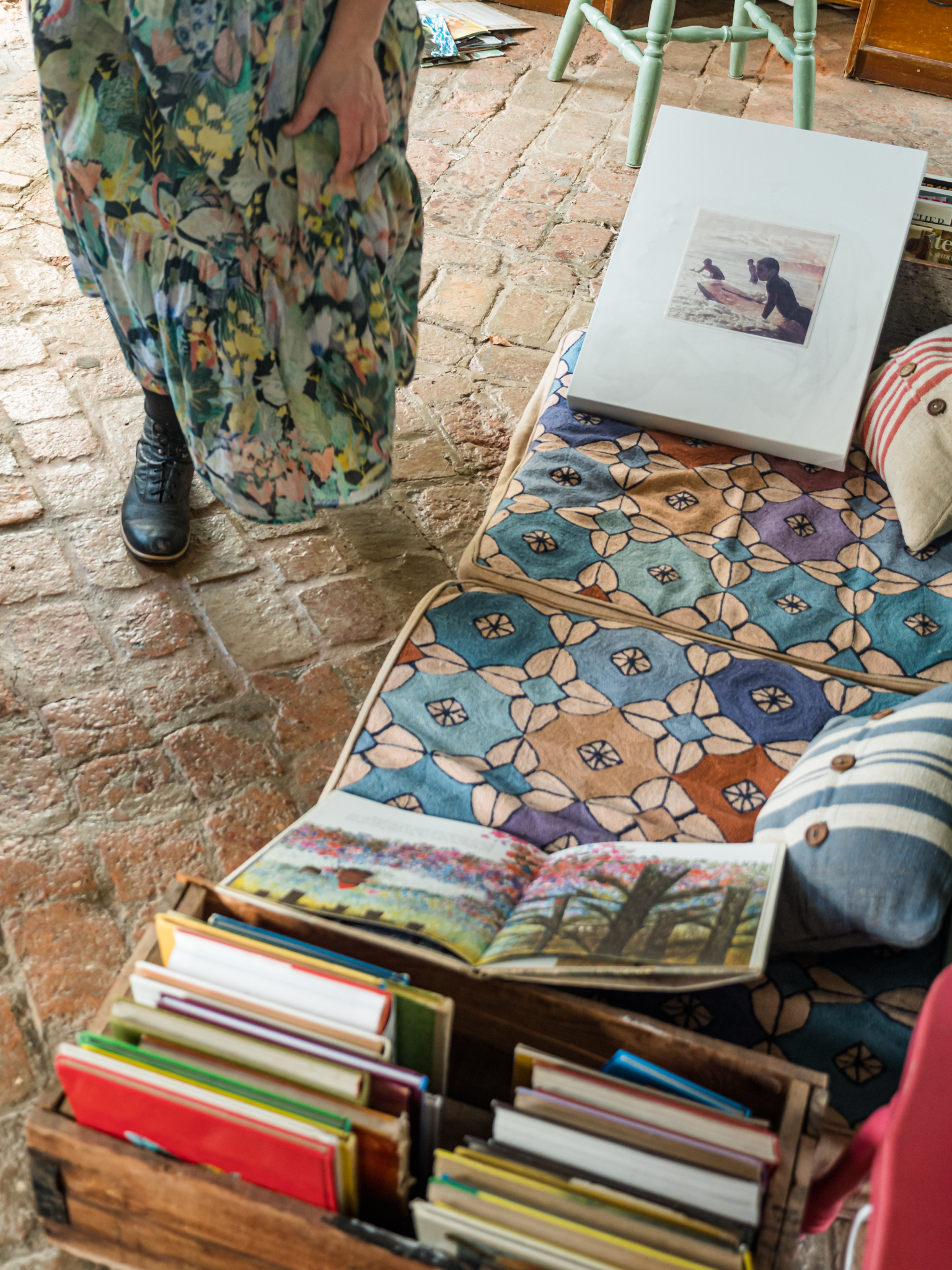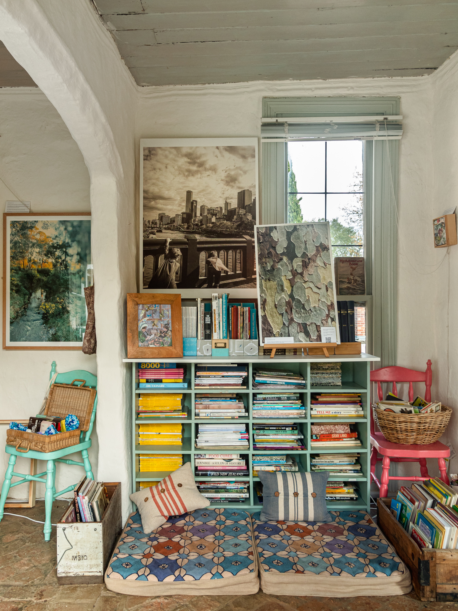 I’m BIG on ritual and mood. So, first, NOTHING can happen here WITHOUT some sort of flame lit – be it one of my candles, or room diffuser, which is ALWAYS burning some sort of certified organic aromatherapy oil(s) grown, distilled and packaged on our family farm in the heart of Zululand, South Africa. Then, the kettle is boiled. A FULL one, in case someone wants to pop over for some collab or chat or just to be. Like I’ve said, this space is like medicine for the soul. Then, SOUND. What is life without music (unless nature or real-life chats provide enough) or some sort of fascinating podcast where I can just learn more and more about intriguing stuff. So, once I have fire, sound & boiling water in my thermos, I get down to business… or play! But all play is business for me, because every bit that happens in that room, contributes to stories. I’d either cut up vintage children’s books, encyclopaedias, children’s Bibles, National Geographics, old greeting cards and magazines to form a story around one of my fine art photographs. I feel a bit like a Sangoma (Traditional African Healer) sourcing all the images and throwing them out in front of me as I move into flow-state, arranging them all onto a canvas so that slowly, the textured layers begin to make sense of all the gazillion movies looping in my psyche. When I’ve done a photoshoot, this is also where I’d edit my photos, most of them which have been shot in this very room, or on the historic Montsalvat grounds surrounding me. When I’m not deconstructing and reconstructing old things into new things or shooting or editing anything, I either write, have other artists or visitors over for coffee or a chat, or dream on my daybed.