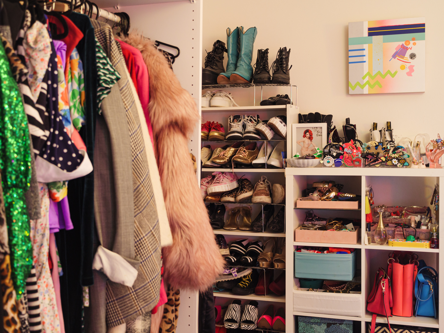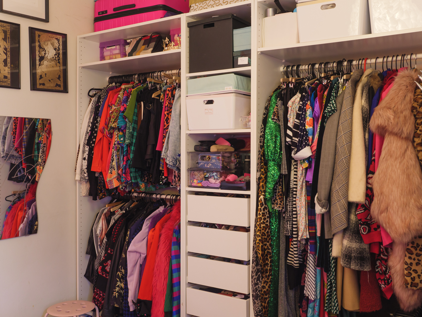 On a practical level, I love the high ceilings. I have a lot of stuff and it’s great to be able to use that vertical space for storage. I don’t believe in having much closed storage. I’m riddled with ADHD so if I can’t see something I’ll forget it exists. I love having a giant open wardrobe where I can see all my clothes at once, and lots of open storage for my many bits. I really love my clothes and accessories, so they might as well become room décor as well!