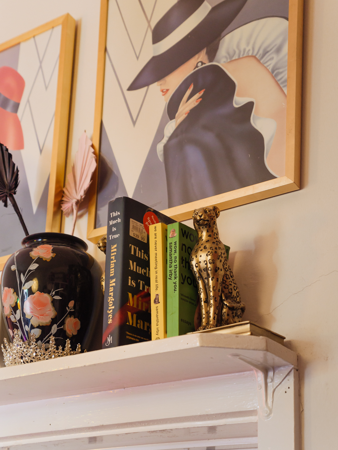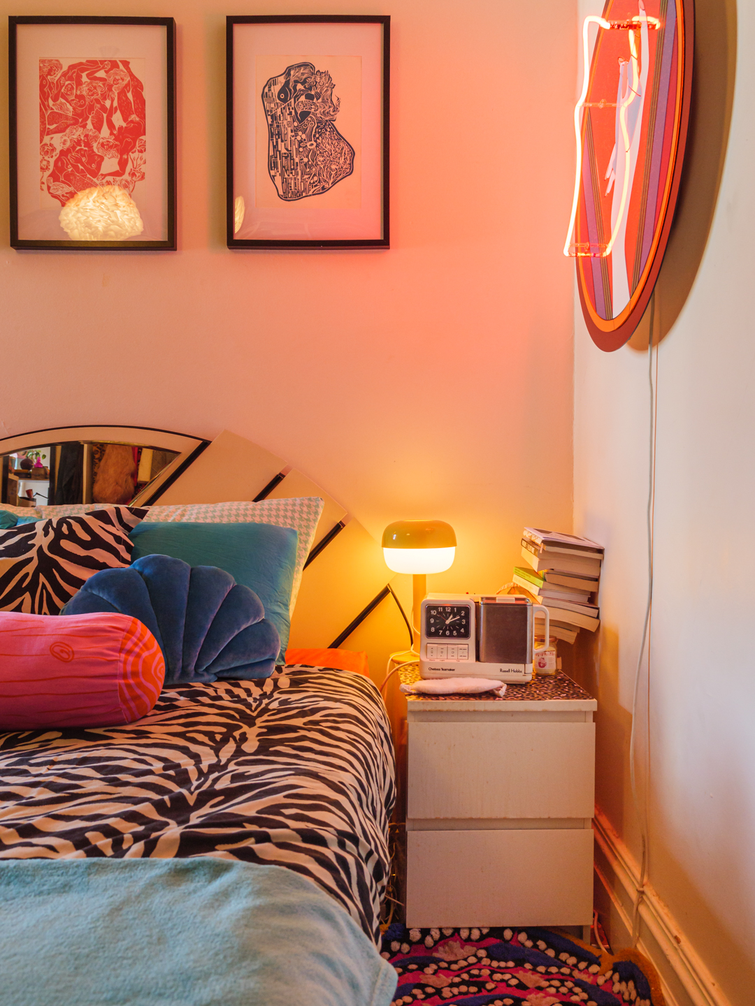 Before I moved in I was a very theoretical decorator- I had lots of ideas but I was always afraid to actually put things on the walls. My housemate has really helped me get over that fear and always reminds me that if you don’t like it, you can always change it. This room is constantly evolving, but the most consistent thing is that when I look around, I see all the things in life that make me happy: friends, glamour, colour, fashion and super queer art. It’s my very own camp little paradise.