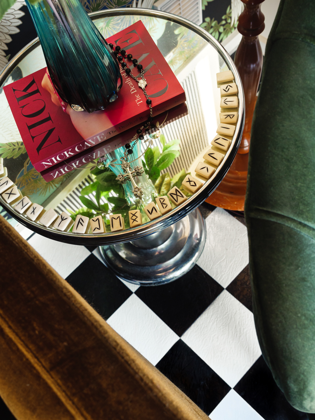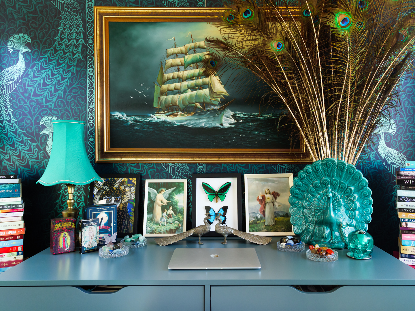 An emerald green velvet chaise lounge, a taxidermy peacock and black crow (peacock obviously won’t fit) and more religious art. I’ve had to really downsize my wardrobe and furnishings, so every new piece has to be really thought about and carefully sized. I’ve always loved have my personality represented in my rooms. Maximalist is my style and you can certainly do that in a tiny. you just need to allow yourself not to hold on to things that were maybe your loves in your ‘20’s & 30’s and embrace every decade as a new mirror of where you are at.